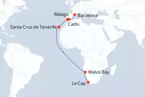 Itinéraire : Barcelone, Malaga, Cadix, Santa Cruz de Tenerife, Walvis Bay, Le Cap, Port Elisabeth, Port Louis, Mascate, Dubai