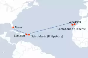 Itinéraire : Miami, San Juan, Saint-Martin (Philipsburg), Santa Cruz de Tenerife, Lanzarote, Gibraltar, Barcelone, Marseille, Ajaccio, Livourne, Civitavecchia - Rome, Valence, Palma de Majorque, Barcelone